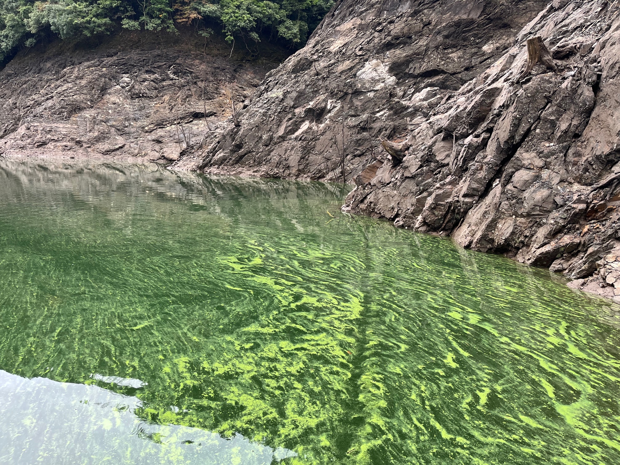 濃いアオコが溜まっていて